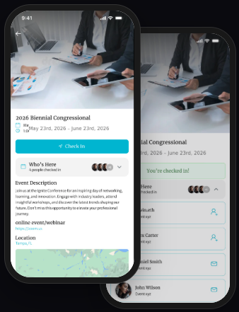 Every event becomes a curated introduction — not a happy accident. Members check in, see who's there, and connect before the room gets loud.